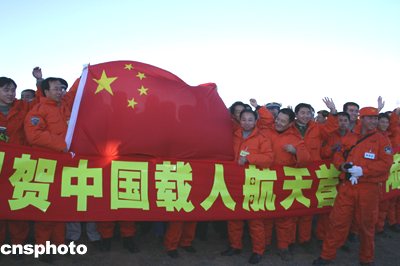 六時四十五分,身著白色宇航服的航天員從返回艙中神采奕奕探頭出來,他把面罩向上一拉,微笑著向迎接他回家的人們揮手致意。一時間、草原上掌聲雷動,許多人激動地流下了熱淚。