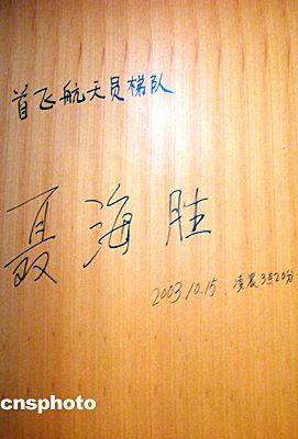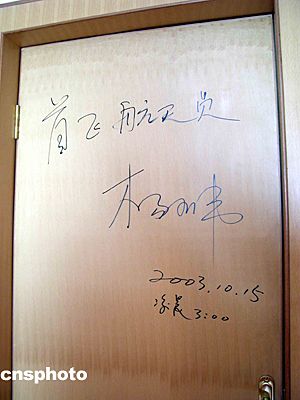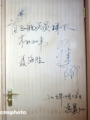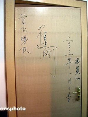 二00三年十月十五日凌晨,中國飛天第一人楊利偉及首飛梯隊航天員于“神舟”五號載人飛船發(fā)射前,在酒泉衛(wèi)星發(fā)射中心航天員公寓“問天閣”的住房房門上簽名留念。中新社記者 孫自法 攝影報道