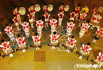 香港工聯(lián)會十六日晚在秀明小學(xué)舉行慶祝活動,祝賀中國首次載人飛船上太空成功,氣氛熱烈。圖為慶祝會上的步操敲擊樂表演。作者:洪少葵
