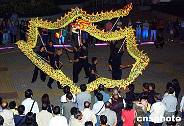 香港工聯(lián)會十六日晚在秀明小學(xué)舉行慶;顒樱YR中國首次載人飛船上太空成功,氣氛熱烈。圖為慶祝會上的金龍表演。作者:洪少葵