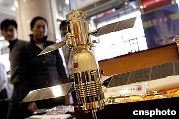 中國載人航天飛船“神舟”五號發(fā)射和回收取得圓滿成功后,北京王府井新華書店門口安放了制作精美的“神舟”五號實(shí)體模型,以標(biāo)價(jià)1000元人民幣進(jìn)行出售。中新社記者:鄒憲