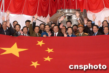 十月十八日,中國“神舟”五號載人飛船返回艙搭載物品開艙儀式在中國航天科技集團(tuán)公司北京空間技術(shù)研制試驗中心舉行。隨載人飛船在太空翱翔二十多小時的巨幅五星紅旗從神舟五號載人飛船返回艙中被取出。中新社記者 張煒攝