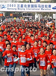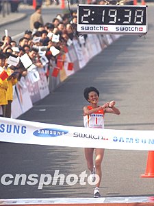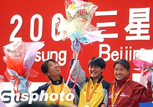 前不久在法國巴黎世界田徑錦標(biāo)賽上取得一枚銅牌的孫英杰是二00三年三星北京國際馬拉松賽女子組唯一的奪冠“大熱門”。在比賽過程中,孫英杰始終處于領(lǐng)跑的第一集團(tuán)之中,并于后半程脫穎而出,最終以二小時(shí)十九分三十九秒的成績輕松奪得女子組冠軍,創(chuàng)造北京國際馬拉松賽女子組歷史最好成績。
