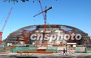 金秋十月,號(hào)稱(chēng)“中國(guó)第一藝術(shù)殿堂”的國(guó)家大劇院工程建設(shè)進(jìn)展順利,跨度達(dá)二百一十二米的巨大穹形屋頂鋼結(jié)構(gòu)骨架已開(kāi)始安裝,國(guó)家大劇院蛋形輪廓初步顯現(xiàn)。中新社記者:張煒