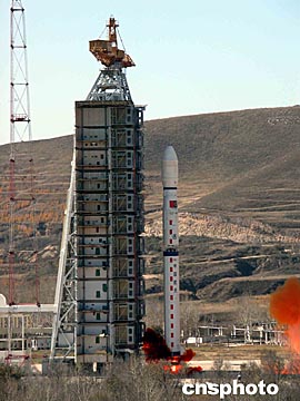 剎那間,伴隨著長長的桔紅的火焰,“長征四號乙”運載沖天而起、直刺蒼穹。震天動地的巨大聲響,在黃土高原上久久回蕩。