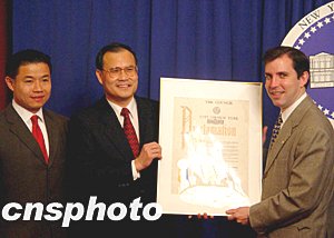 紐約市議會二十二日向中國駐紐約總領(lǐng)館頒發(fā)賀狀,祝賀中國首次發(fā)射載人航天飛船“神舟五號”成功。圖為議長米勒(右)向中國駐紐約總領(lǐng)事劉碧偉(中)頒發(fā)賀狀,左為提出頒發(fā)賀狀動議的紐約市議會第一位華裔議員劉醇逸。作者:李杭