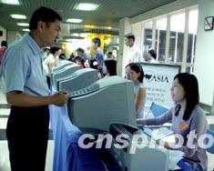 在海口美蘭機(jī)場國際到大廳,記者一進(jìn)大門就看到近十臺電腦一字排開,在電腦前工作的一律是“漂亮美眉”。