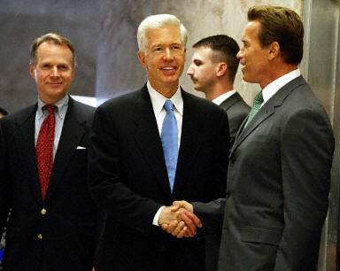 新當(dāng)選的加州州長(zhǎng)阿諾-施瓦辛格于周四會(huì)晤了競(jìng)選中的老對(duì)手、現(xiàn)任州長(zhǎng)戴維斯。雙方共同宣稱(chēng)已經(jīng)開(kāi)始“友好關(guān)系”,并表示在阿諾正式接任州長(zhǎng)職務(wù)之前,兩人將并肩努力。
