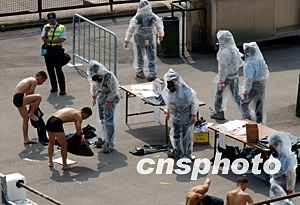 警方?jīng)_鋒隊為受到毒氣襲擊的傷者現(xiàn)場消毒清洗。中新社記者:洪少葵