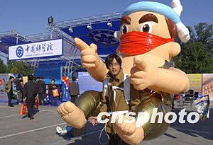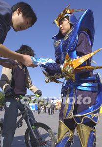 來自韓國、日本等地的互聯(lián)網(wǎng)游戲提供商與中國網(wǎng)絡(luò)游戲企業(yè)擺開陣勢,“一決高下”。圖為網(wǎng)絡(luò)游戲人物向參觀者派發(fā)產(chǎn)品資料。中新社記者:張煒