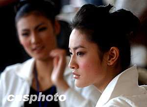參加新絲路世界模特大賽的中國小姐,十月二十八日在以古色古香的發(fā)式出席杭州大廈的見面會。中新社記者:賈國榮