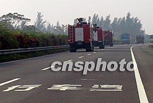 記者今天與海南省公安消防總隊(duì)進(jìn)口的多功能消防車隊(duì)四度“遭遇”:一清早這個(gè)靜候在?谑旋埨ツ下放缘幕鸺t車隊(duì)吸引了路人的視線;大約九點(diǎn)半,在高速公路上,它們從記者車旁呼嘯而過;當(dāng)記者抵達(dá)博鰲亞洲論壇國際會(huì)議中心時(shí),只見這個(gè)消防隊(duì)伍已演練完畢撤離現(xiàn)場;而下午四時(shí),在海口市的街頭,記者又一次與它們相遇。