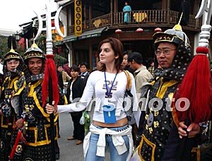 參加新絲路世界模特大賽的外國小姐,十月三十日游覽杭州河坊街時,扮作古代護(hù)城的中國武士。中新社記者:賈國榮