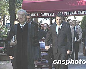 三十日上午十點左右,宋美齡的靈柩從曼哈頓法蘭克坎貝爾殯儀館運出,移至紐約上州的芬克里夫墓園,包括孔令儀夫婦在內(nèi)的眾多親友一起陪護在旁,并隨靈車一起前往墓園。中新社記者:趙海燕