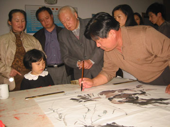 李老師非常開心,取來新的紙筆,揮毫即興做了一幅駿馬回首圖,提詞:"繁民學畫"贈送給謝伯子,感謝他對愛心之旅的支持。