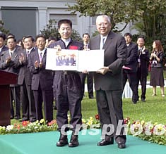 11月5日,香港特區(qū)政府為中國首次載人航天飛行代表團(tuán)舉行歡送儀式,特首董建華向楊利偉致送訪港時的相片。中新社記者:鄧慶樂