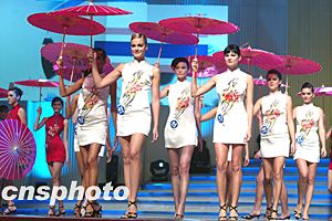 選手展示具有中國傳統(tǒng)色彩的現(xiàn)代旗袍裝。中新社記者 毛建軍 攝影