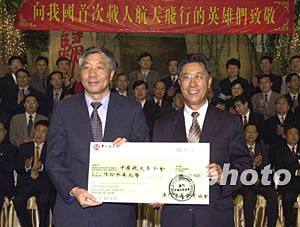 澳門中國企業(yè)協(xié)會會長吳亦新六日代表該協(xié)會向中國航天基金會捐款六十三萬港圓,中國載人航天飛行代表團團長胡世祥代為接收。中新社記者:李剛