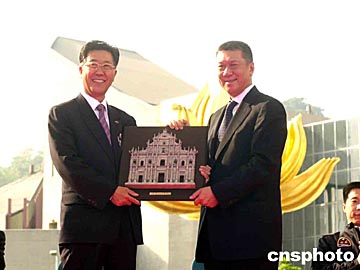 澳門特區(qū)行政長官何厚鏵在儀式上向胡世祥贈(zèng)送紀(jì)念品。中新社記者:李剛
