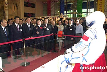 澳門特區(qū)行政長官何厚鏵、全國政協(xié)副主席馬萬祺、中央駐澳聯(lián)絡(luò)辦主任白志健等五日參觀澳門特區(qū)政府舉辦的「中國首次載人航天飛行展」時(shí)聽取楊利偉的介紹。中新社記者:李剛