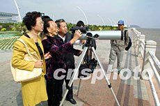 10日首次來廈門與養(yǎng)子傅宗漢相會(huì)的92歲金門老大娘翁李榮旦在兩家親人的陪同下,游覽廈門名勝古跡及新景觀廈門環(huán)島路、會(huì)展中心等地。圖為金門老大娘翁李榮旦在廈門環(huán)島路通過高倍望遠(yuǎn)鏡觀看金門。作者:向天