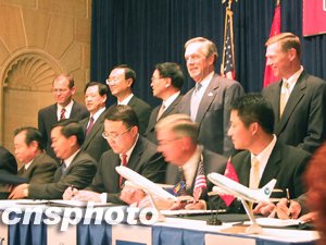 中新網(wǎng)華盛頓11月13日電(記者余東暉)中國(guó)與美國(guó)于美國(guó)時(shí)間十二日分別在華盛頓和底特律簽署了三個(gè)大宗采購(gòu)合同,總價(jià)值超過六十億美元。