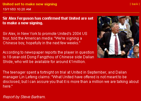 據(jù)曼聯(lián)隊官方網(wǎng)站透露,董方卓在今年9月份曾在曼聯(lián)隊試訓,其出色的表現(xiàn)也征服了包括弗格森在內(nèi)的曼聯(lián)俱樂部的管理層。