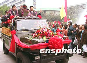 中國(guó)首位航天員楊利偉及載人航天工程先進(jìn)事跡報(bào)告團(tuán)一行十四日上午來(lái)到重慶大學(xué),受到重慶數(shù)萬(wàn)大中小學(xué)生的熱烈歡迎。圖為楊利偉向歡迎的人群揮手致意。作者:鄒輝