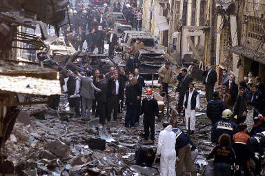 第一起爆炸發(fā)生在伊斯坦布爾最大的猶太教會堂外,另外一起爆炸發(fā)生在離這座教會堂5公里外的另外一座猶太教會堂。兩座教會堂已經(jīng)嚴重受損,部分建筑已經(jīng)倒塌,濃濃的黑煙從現(xiàn)場冒出,到處都是碎玻璃、扭曲變形的金屬。