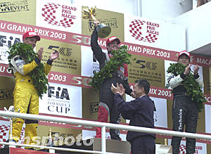 澳門第五十屆格蘭披治大賽車十六日舉行最精彩的三級(jí)方程式大賽,澳門特區(qū)行政長(zhǎng)官何厚鏵賽后親自為獲得前三名的車手頒獎(jiǎng)。中新社記者:李剛