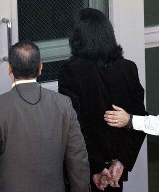 接近美西時(shí)間中午時(shí)分,邁克爾-杰克遜在雙手被手銬銬住的情況下,由警方和私人律師陪同進(jìn)入圣巴巴拉警察局。