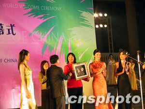 世界小姐機(jī)構(gòu)的主席朱莉婭·莫莉與第五十二屆世界小姐阿金,首先步下舷梯;曾經(jīng)在二00一、二00二年代表中國參加世界小姐總決賽獲得名次并獲得“亞洲美皇后”稱號(hào)的中國美女李冰、吳英娜,仿佛歸隊(duì)般將鮮花送到了“美麗同仁”的懷中。