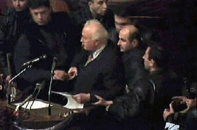 11月22日,格魯吉亞新一屆議會舉行第一次會議。當謝瓦爾德納澤在議會演講時,幾十名反對派人士沖入議會大廈,要求總統(tǒng)辭職。總統(tǒng)的支持者和反對派人士發(fā)生爭執(zhí),議會大廳一片混亂。謝瓦爾德納澤隨即在保鏢的保護下撤離,并表示拒絕辭職。