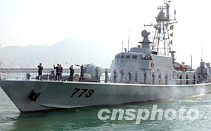 十一時(shí)二分,昂船洲軍港內(nèi)水波微泛,魚(yú)兒歡躍,在“順德”號(hào)導(dǎo)彈護(hù)衛(wèi)艇的率領(lǐng)下,包括一艘登陸艇和一艘高速巡邏艇在內(nèi)的“七七一”編隊(duì)進(jìn)入基地。下午二時(shí)許“七七三”編隊(duì)離港,,返回深圳基地。