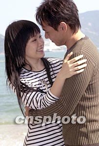 歌星黃凱芹、關(guān)心妍11月26日在香港赤柱正灘為無線電視拍攝音樂劇《愛在富豪海灣的日子》外景。圖為兩人一幕親熱鏡頭。作者:鄧慶樂
