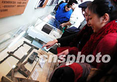 北京“井岡山大型展覽”十天引來七萬多觀眾。圖中兩位參觀的女孩正在討論眼前展品(紅軍當(dāng)年蓋房子的工具)是什麼。半個(gè)多世紀(jì)前,毛澤東等在中國南方叢山峻嶺的戰(zhàn)爭故事使許多參觀者感嘆。中新社記者:王麗南