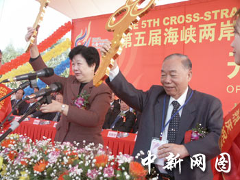 全國(guó)政協(xié)副主席張克輝與福建省委副書記、省紀(jì)委書記梁綺萍女士,在第五屆海峽兩岸(福建漳州)花卉博覽會(huì)開幕儀式上,共同轉(zhuǎn)動(dòng)此次盛會(huì)的金鑰匙。蔡文原攝