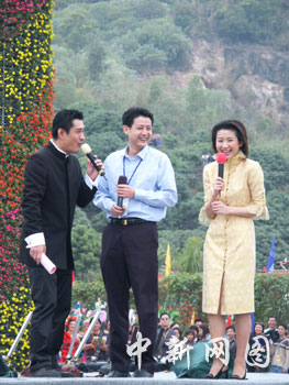 中國(guó)女排主教練陳忠和(中)與演唱會(huì)主持人黃安(左)、王小丫