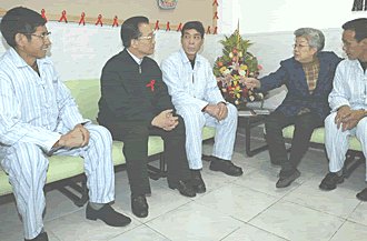 上午十時三十分,溫家寶和國務院副總理吳儀在中共北京市委書記劉淇,北京市代市長王岐山陪同下,來到北京市地壇醫(yī)院。這所醫(yī)院是目前中國內(nèi)地唯一擁有艾滋病藥物研究資格的國家級臨床基地,至今已診治六百余例艾滋病患者。