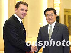 胡錦濤說,中斯兩國人民有著傳統(tǒng)友誼。建交十一年來,兩國關(guān)系發(fā)展順利。兩國領(lǐng)導(dǎo)人的友好交往有力地推動著兩國關(guān)系的健康發(fā)展。雙方在經(jīng)貿(mào)及其他領(lǐng)域的合作取得了積極成果,在國際組織中合作良好。中方贊賞并感謝斯政府堅持一個中國政策,支持中國的統(tǒng)一大業(yè)。