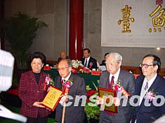 二00三年度香港何梁何利獎五日下午在北京釣魚臺國賓館舉行盛大的頒獎大會,植物學(xué)家吳征鎰(左二)、生物化學(xué)家鄒承魯(左三)分獲何梁何利基金“科學(xué)與技術(shù)成就獎”,中國國務(wù)委員陳至立、全國政協(xié)副主席王選向這兩位科學(xué)家頒獎。陶勁松 攝