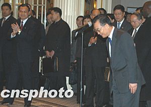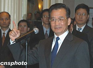 美東時(shí)間十二月七日下午,中國(guó)總理溫家寶甫抵紐約,即接見(jiàn)華僑華人、留學(xué)生和中資機(jī)構(gòu)代表。溫家寶說(shuō),大家冒著嚴(yán)寒風(fēng)雪,守候在這里好幾個(gè)小時(shí),歡迎我和我的同事。大家的這份情意,不僅是給我和同事的,更是給祖國(guó)和人民的。他代表中國(guó)人民和中國(guó)政府,向旅居在美國(guó)的華僑、華人、留學(xué)生,向來(lái)自香港、澳門(mén)和臺(tái)灣的同胞,向領(lǐng)館的工作人員,致以親切的問(wèn)候和良好的祝愿。隨后他向前方和左右三鞠躬,感謝僑胞們的熱情歡迎。作者:陳建