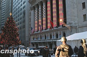 紐約證券交易所正門(mén)上方懸掛著中國(guó)國(guó)旗,準(zhǔn)備迎接首次訪(fǎng)美的中國(guó)總理溫家寶為周一股市開(kāi)盤(pán)鳴鐘。證交所門(mén)前警備森嚴(yán),警車(chē)重重。中新社記者 陳建 攝