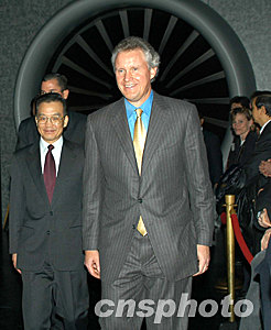 正在紐約訪問的中國總理溫家寶美東時間十二月八日下午,在美國通用電氣公司總裁兼首席執(zhí)行官伊梅爾特(右)陪同下,參觀美國通用電氣公司。中新社記者:趙海燕