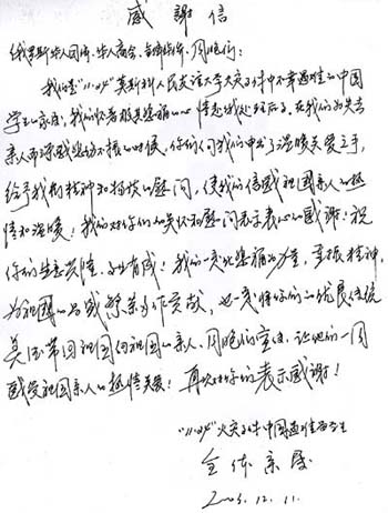 我們是“11·24”莫斯科人民友誼大學火災事件中不幸遇難的中國留學生家屬,我們懷著極其悲痛的心情赴俄處理后事。在我們?yōu)槭ビH人而深感悲傷不振的時候,你們向我們伸出了溫暖關愛之手,給予我們精神和物質(zhì)的慰問,使我們信感祖國親人的熱情和溫暖。我們對你們的關懷和慰問表示衷心的感謝!祝你們生意興隆、事業(yè)有成!