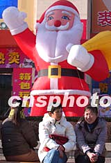 圣誕節(jié)臨近,一個高大的充氣圣誕老人站立在北京王府井某商場門口。經(jīng)歷了非典創(chuàng)傷的北京商家,希望在年終歲末的消費高潮中贏得商機。中新社記者:張煒