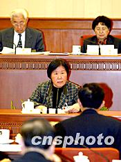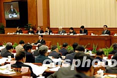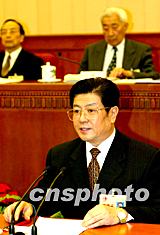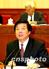 中共中央政治局委員王兆國,二十二日在十屆全國人大常委會(huì)第六次會(huì)議上作中共中央關(guān)于修改憲法部分內(nèi)容建議的說明。中新社記者:滿會(huì)喬