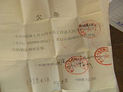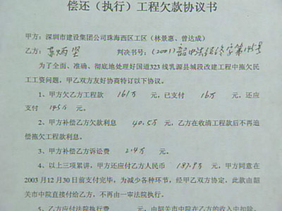 林景惠:“民工投勞力,還有一些小老板也代資。比如我們請(qǐng)下面的包工頭,給我們完成工程的話,我們第二步就給股份。第二步就答應(yīng)在一年內(nèi)加銀行利息,加倍的銀行利息給他們!睋(jù)調(diào)查,自1999年底新股東進(jìn)入后,合作三方股東打起了官司,一些包工頭和民工代表為追回工錢,也將丙方告上了法庭,2001年,韶關(guān)中級(jí)人民法院執(zhí)行了財(cái)產(chǎn)保全,凍結(jié)了收費(fèi)站的1300萬元收費(fèi)款。林景惠:“有約定完工過后就付清所有我的工資部分,付清80%剩余的部分就在六個(gè)月之內(nèi)全部付清。1996年6月份我就全部把工做完了,做完了就一直等錢,一直等到現(xiàn)在。”記者:“一年以后工程完工了,但是你們卻沒有能力來支付民工這筆錢?”林景惠:“沒辦法。說實(shí)話對(duì)民工這個(gè)欠款我是深表同情的,所以從1996年開始全部收入基本上來講,就給這個(gè)工程隊(duì)我們都有付的清單。”記者在收費(fèi)站采訪時(shí),正碰到幾個(gè)民工拿著判決書來討工錢。在調(diào)查中記者發(fā)現(xiàn),有些判決已生效3年多,但民工還是沒有拿到工錢。記者:“這些錢全部就給了施工隊(duì),付給施工隊(duì),施工隊(duì)總共欠了才一千多萬。你這兩千多萬都給他了,那就應(yīng)該說是早還清了,實(shí)際上你們欠了不止一千多萬!泵窆ぃ骸皩(shí)際不止,所欠的款項(xiàng)應(yīng)該是達(dá)到了三千萬吧,兩千多萬、三千萬左右。”