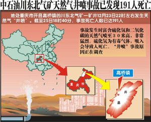 截止25日十九點(diǎn),重慶市開(kāi)縣天然氣井噴事故已造成一百九十一人死亡。