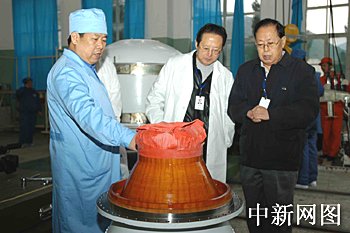 “長(zhǎng)征二號(hào)丙”改進(jìn)型運(yùn)載火箭總指揮鄭全寶(中)、總設(shè)計(jì)師李占奎(右)查看火箭上面級(jí)發(fā)動(dòng)機(jī)。荊鷹 攝